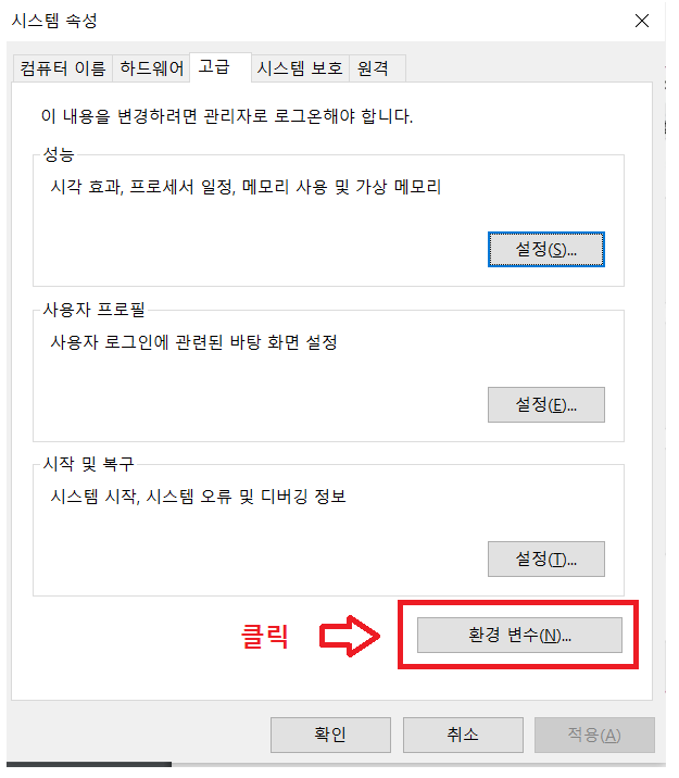 (2) 고급 탭으로 이동 후 환경변수 버튼 클릭